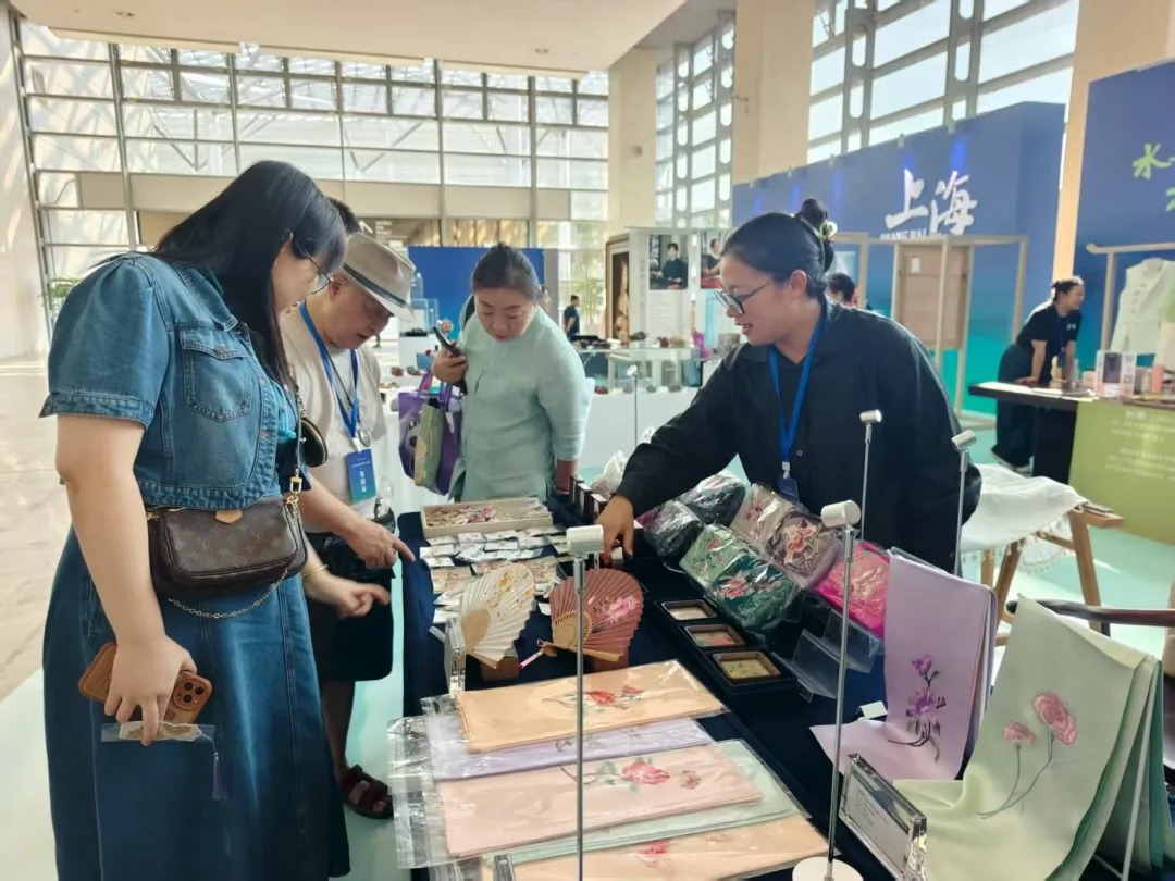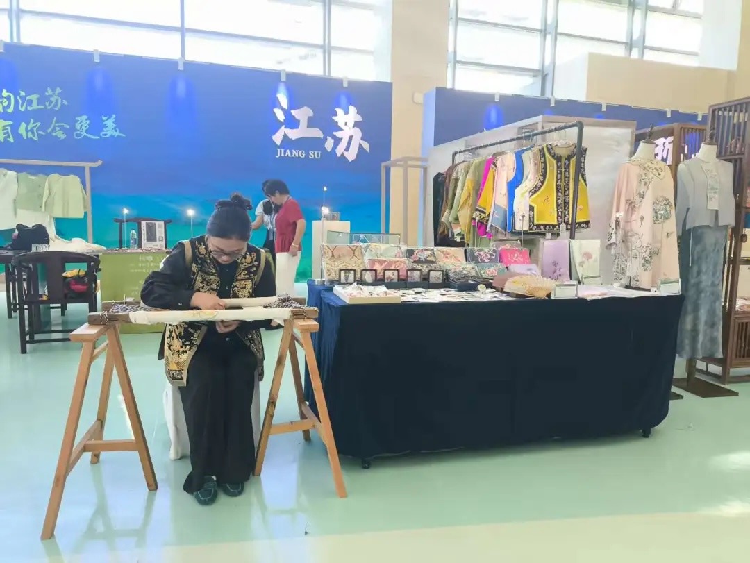 苏绣非遗新秀马怡红指尖翻飞,细如发丝的彩线在绷架上穿梭,将江南水乡的灵动呈现于绣品之上,引得观众驻足欣赏针尖上的匠心。