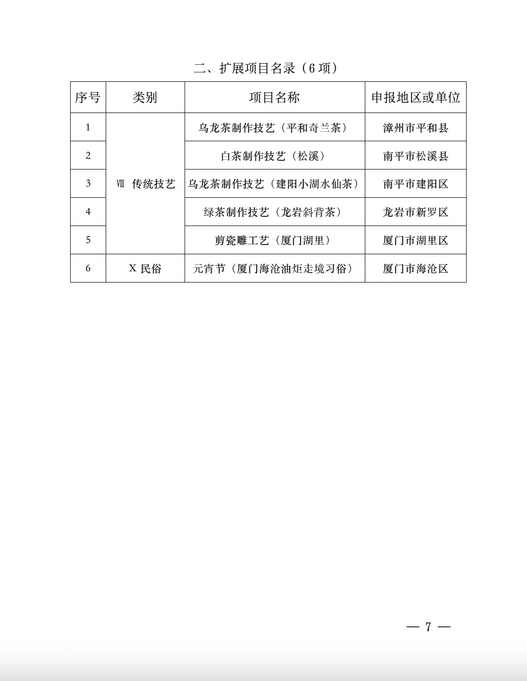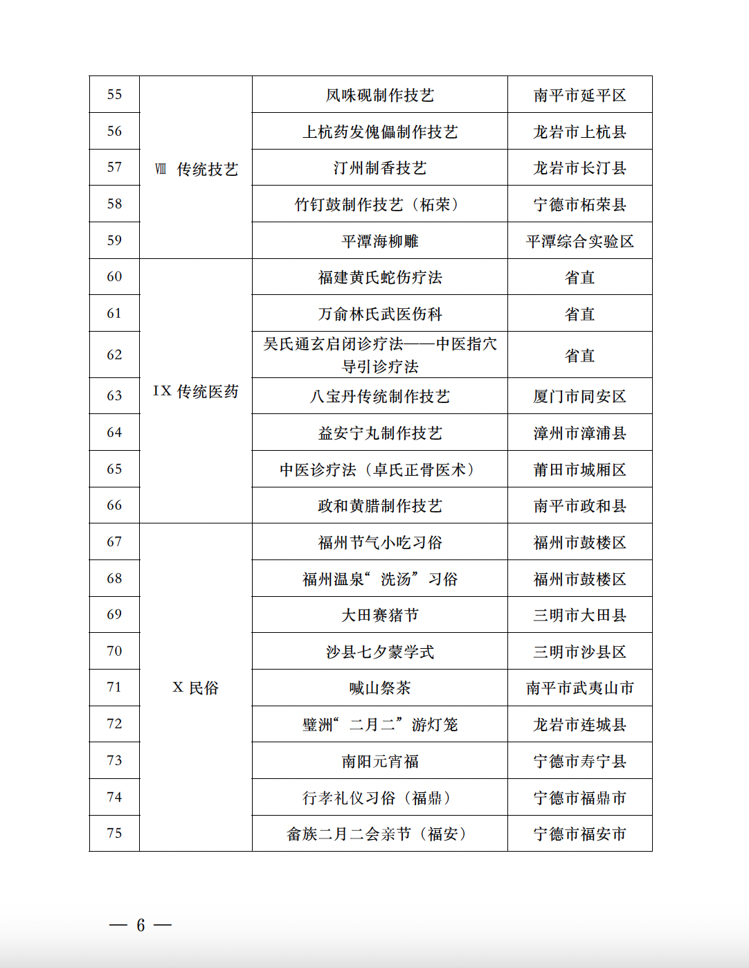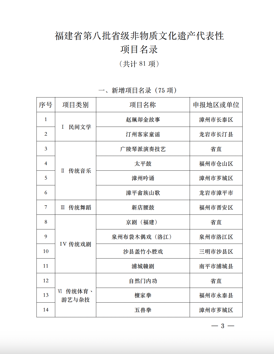 根据《中华人民共和国非物质文化遗产法》《福建省非物 质文化遗产条例》有关规定,经研究,同意省文旅厅组织专家 评审后提出的第八批省级非物质文化遗产代表性项目名录 81 项,其中新增项目名录 75 项,扩展项目名录 6 项,现予公布。