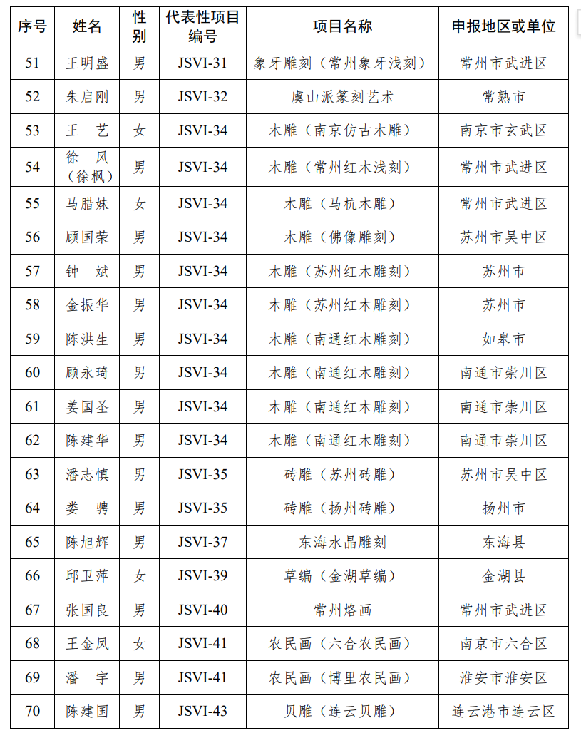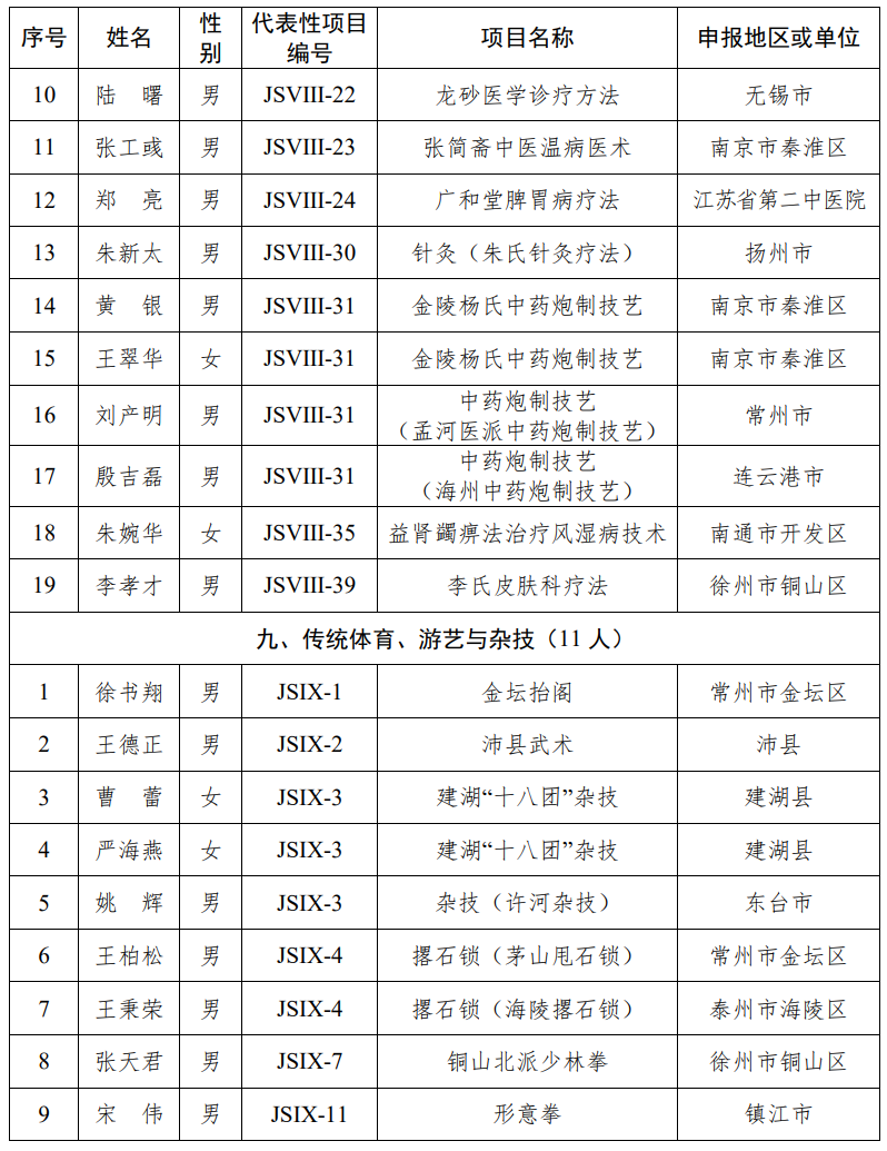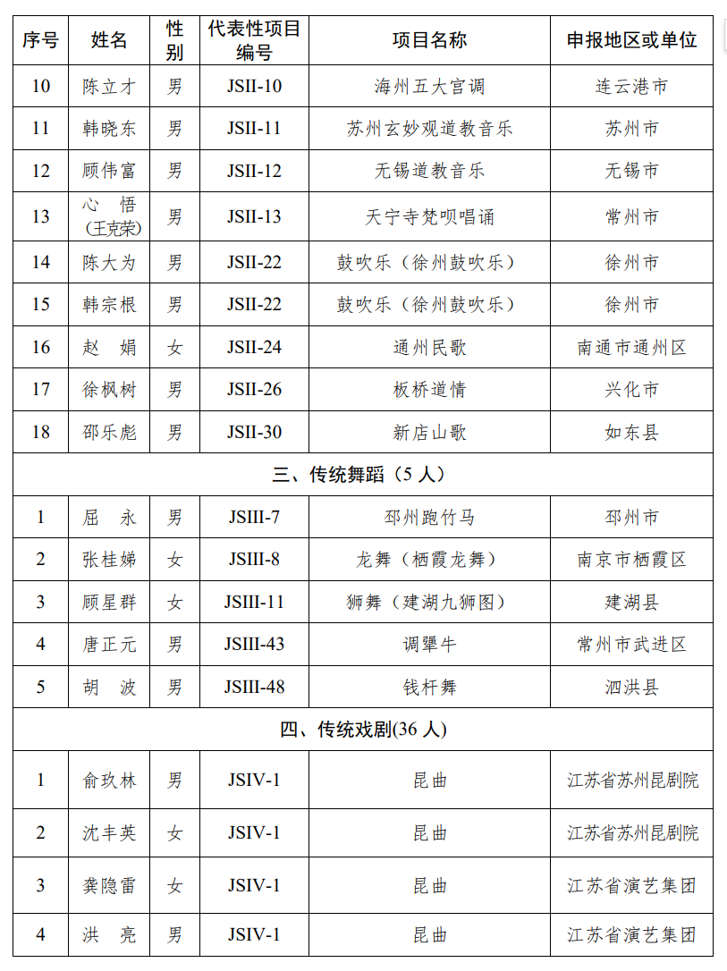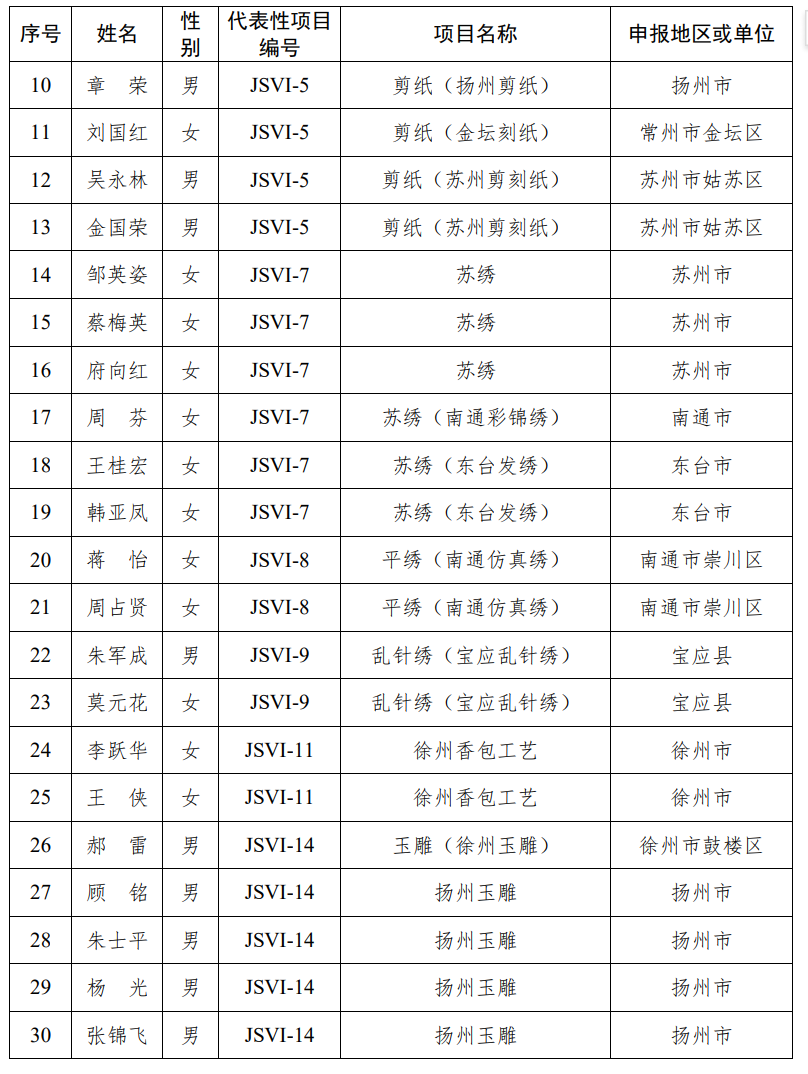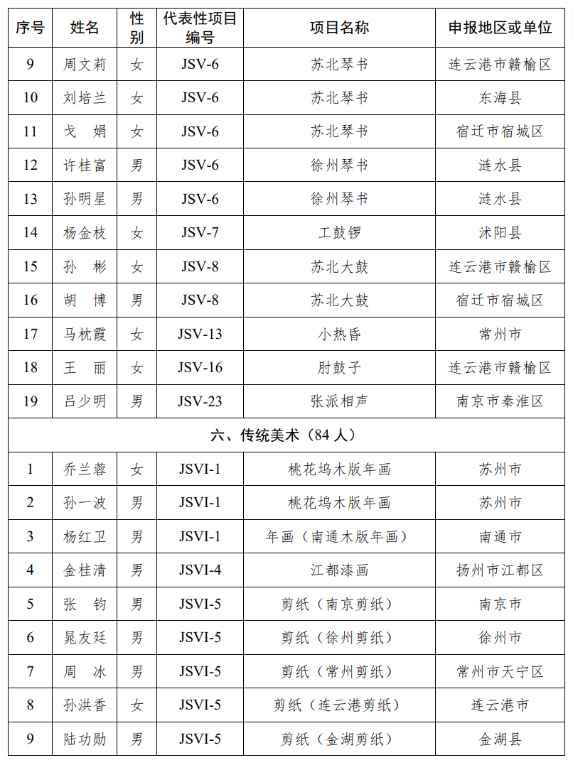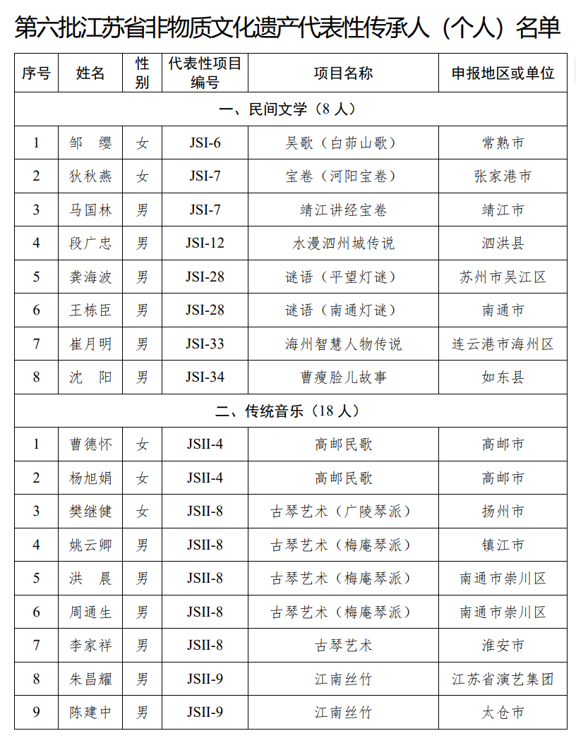 第六批江苏省非物质文化遗产代表性传承人名单公布