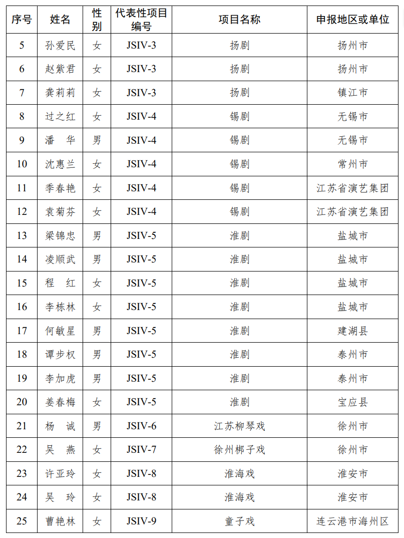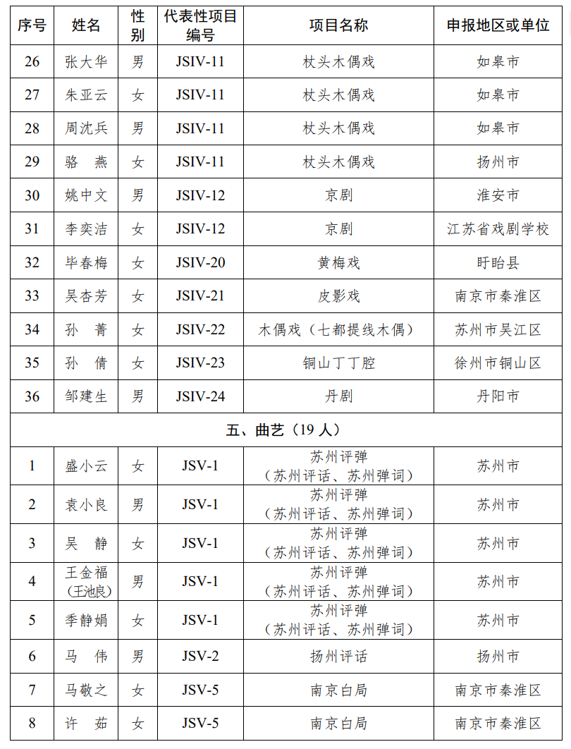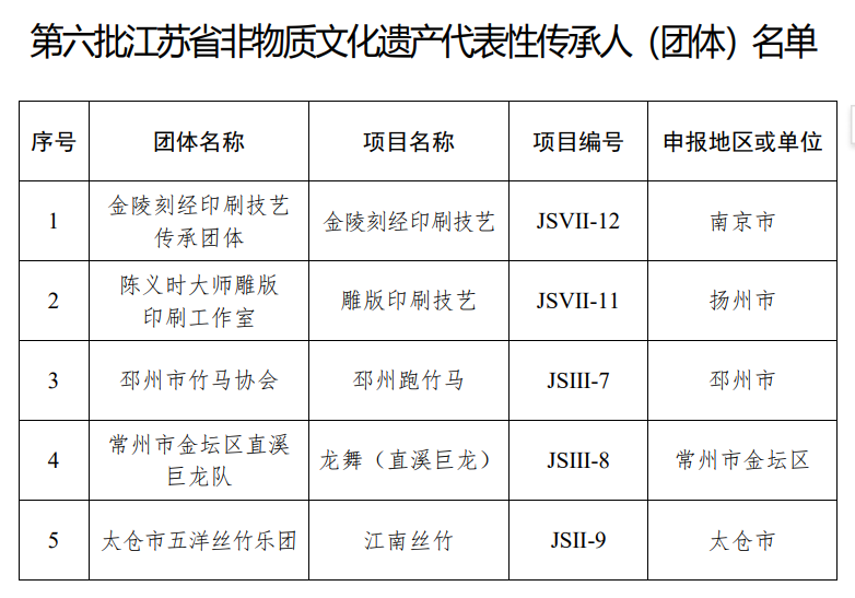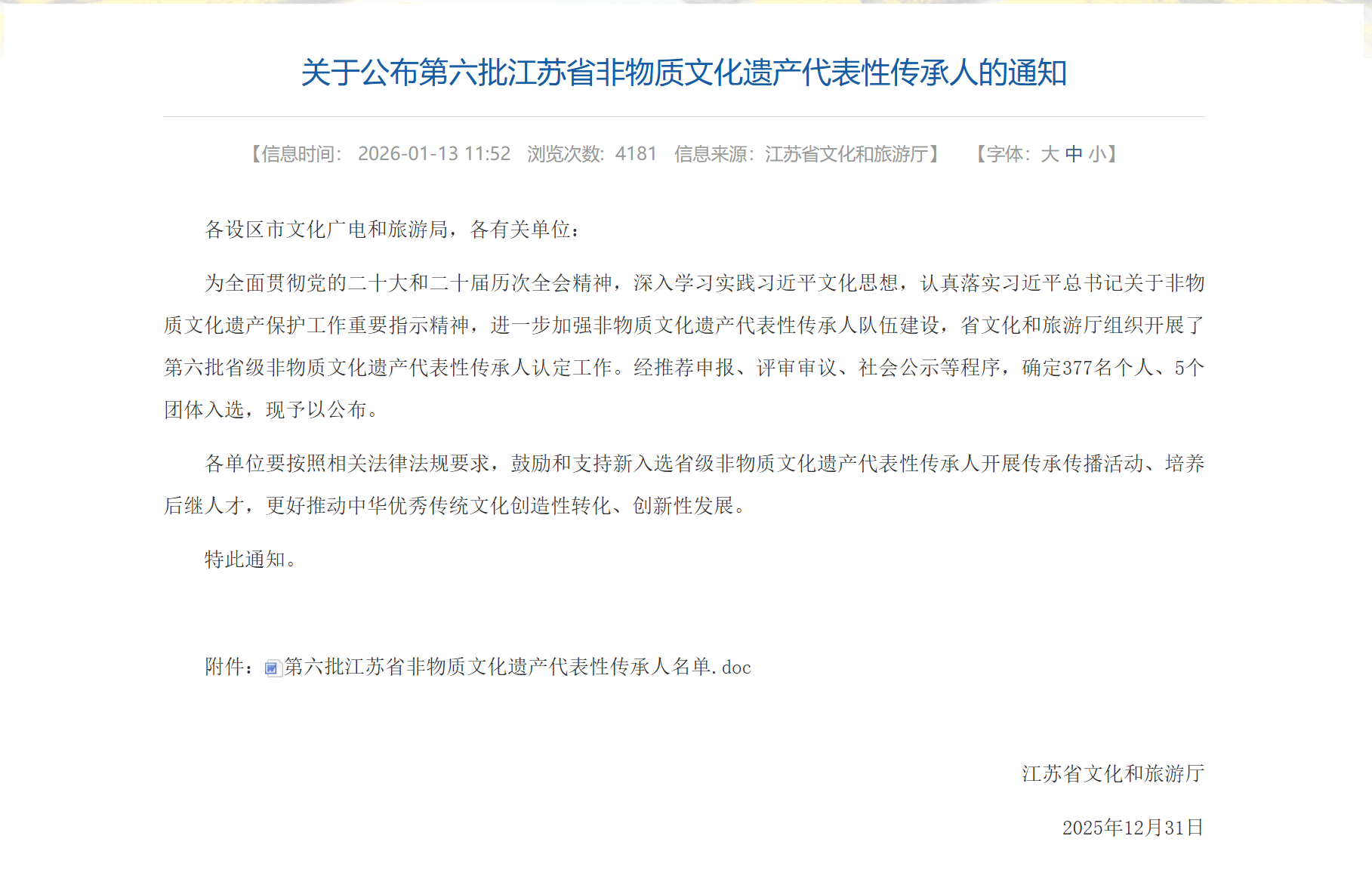 2026年1月13日,江苏省文化和旅游厅公布第六批省级非遗代表性传承人名单,共377人,5个团体。