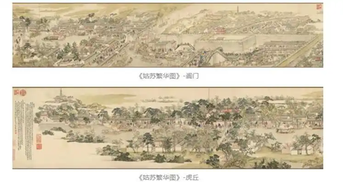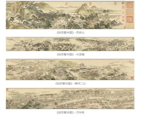 清代画家徐扬绘就的《姑苏繁华图》自苏州西南灵岩山起,经木渎镇、横山、石湖、苏州郡城,出阊门、沿山塘街,终至虎丘山,完整呈现了“一村一镇一城一街” 的百里水乡景观,现藏于辽宁省博物馆。